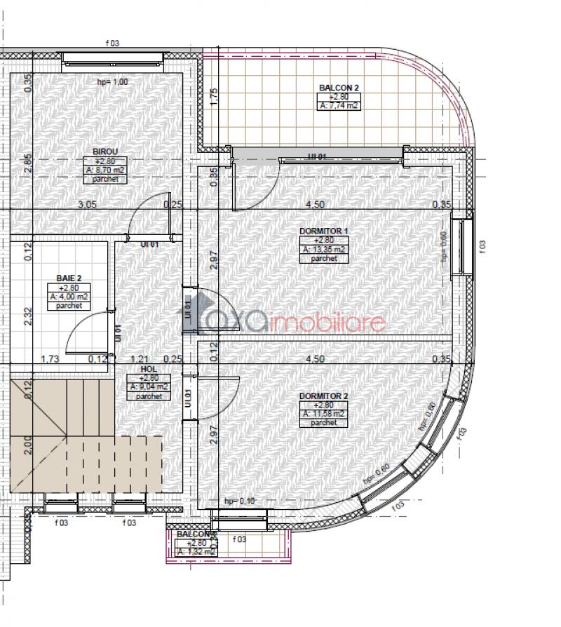 Etaj / Al doilea nivel: 2 dormitoare, 1 birou, 1 hol, 1 baie, 2 balcoane.