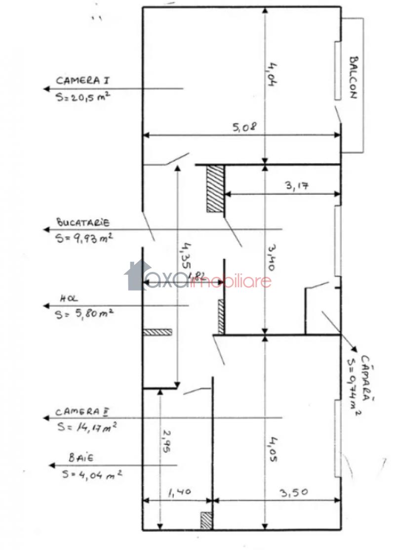 Compartimentare: 2 camere decomandate (1 living, 1 dormitor), 1 bucatarie, 1 camara, 1 hol, 1 baie + 1 balcon.