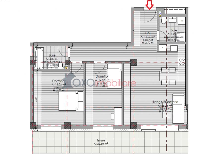 Suprafata utila este de 83.77 mp, compartimentata intr-un living cu bucatarie de tip open space, 2 dormitoare, 2 bai, hol si 1 terasa (22.50 mp).