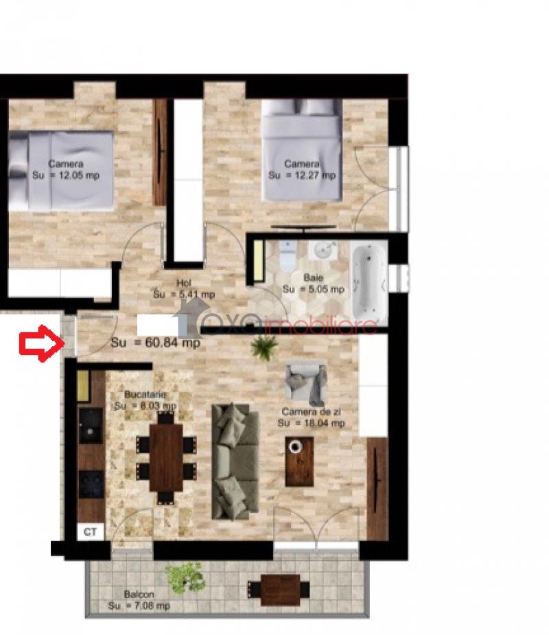 Suprafata utila este de 60.84 mp, fiind compartimentata intr-un living cu 1 bucatarie de tip open space, 2 dormitoare, 1 baie, hol + 1 balcon (7 mp).