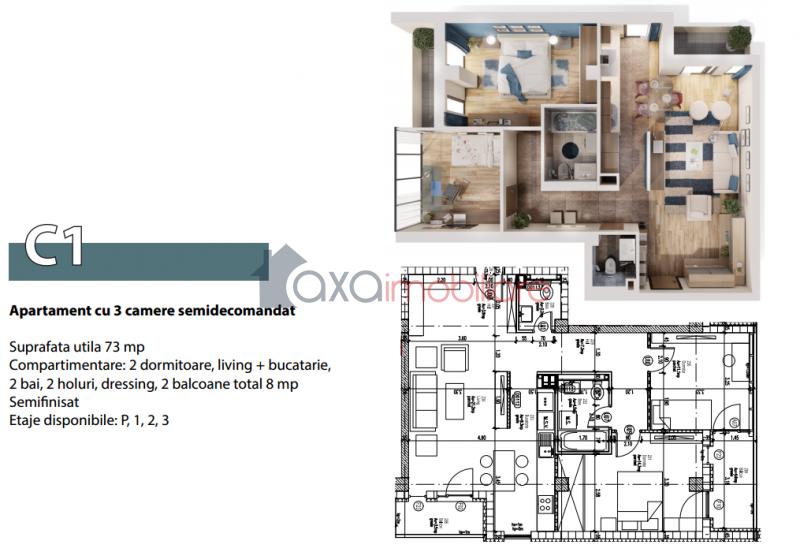 Oferim spre vanzare apartament cu 3 camere, cu suprafata utila de 73 mp, semidecomandat, pozitionat la etajul 1 al unui imobil nou, finalizat in 2015, cu regim de inaltime P+10E, ce dispune de lift. Apartamentul este situat in cartierul Zorilor, zona Sigma, intr-o locatie linistita. Este compus din 1 living cu 1 bucatarie de tip open space, 2 bai, 2 dormitoare, 2 holuri si 2 balcoane. Dispune de geamuri termopan cu tamplarie din PVC si usa metalica la intrare. Se vinde la stadiul de semifinisat cu sapa autonivelanta si peretii gletuiti. Aceleasi compartimentari si suprafete se pot achizitiona atat la parter, cat si la etaje intermediare.