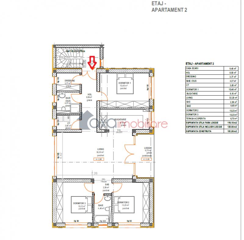 Apartamentul are o suprafata utila de 125 mp si este compus dintr-un living, 1 bucatarie, hol, dressing, CT, 2 bai, sas, 3 dormitoare si 1 terasa acoperita.