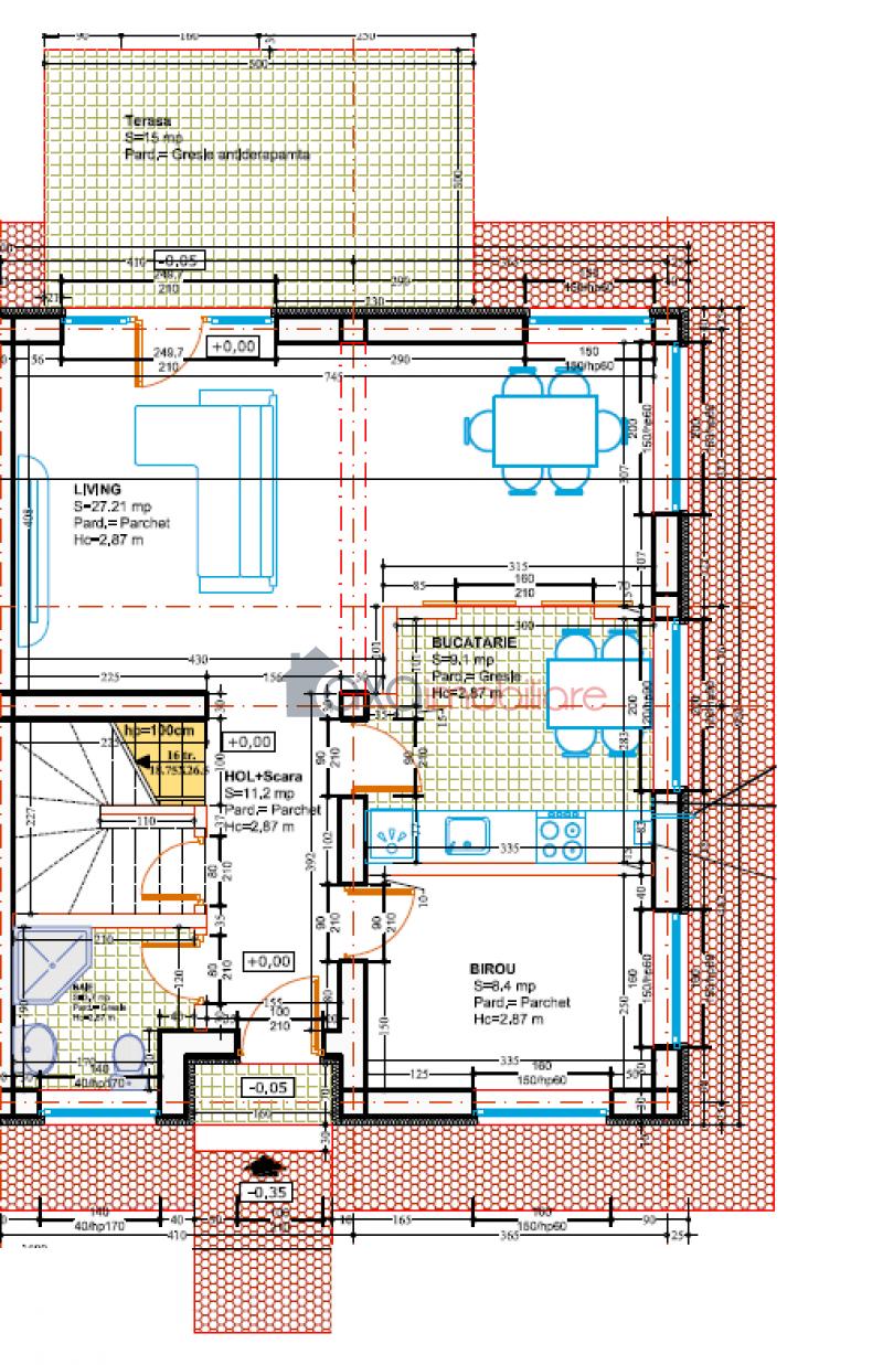 La primul nivel - PARTER se afla zona de zi; compusa dintr-un living cu dining, 1 bucatarie, 1 birou, 1 hol, 1 baie, casa scarii + 1 terasa.