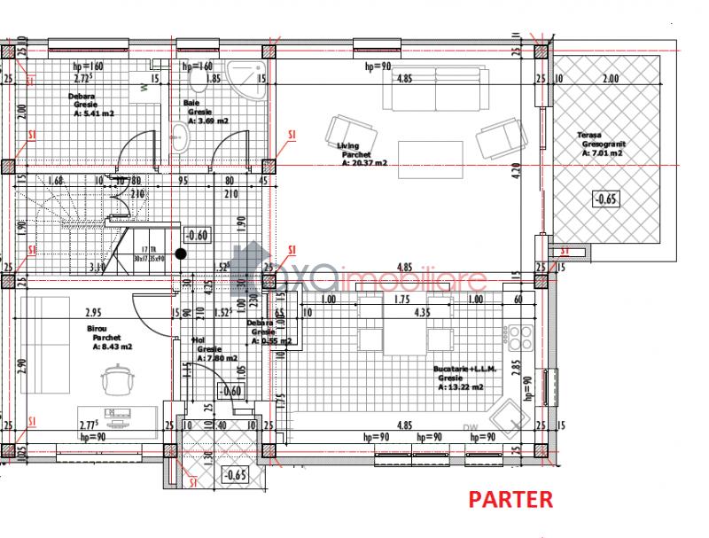 PARTER: 1 living cu 1 bucatarie open space, 1 birou, 1 baie, 1 hol, 1 debara si 1 terasa.