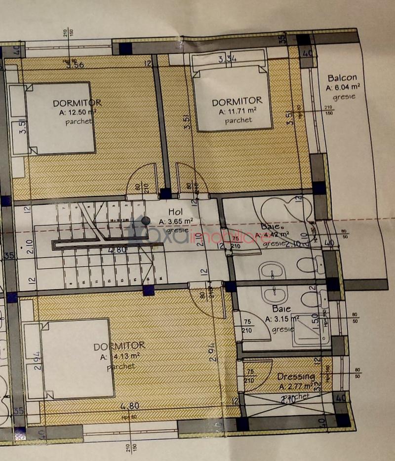 ETAJ 1: 3 dormitoare, 2 bai, 1 hol, 1 dressing si 1 balcon. (Unul din dormitoare dispune de baie proprie si de dressing).